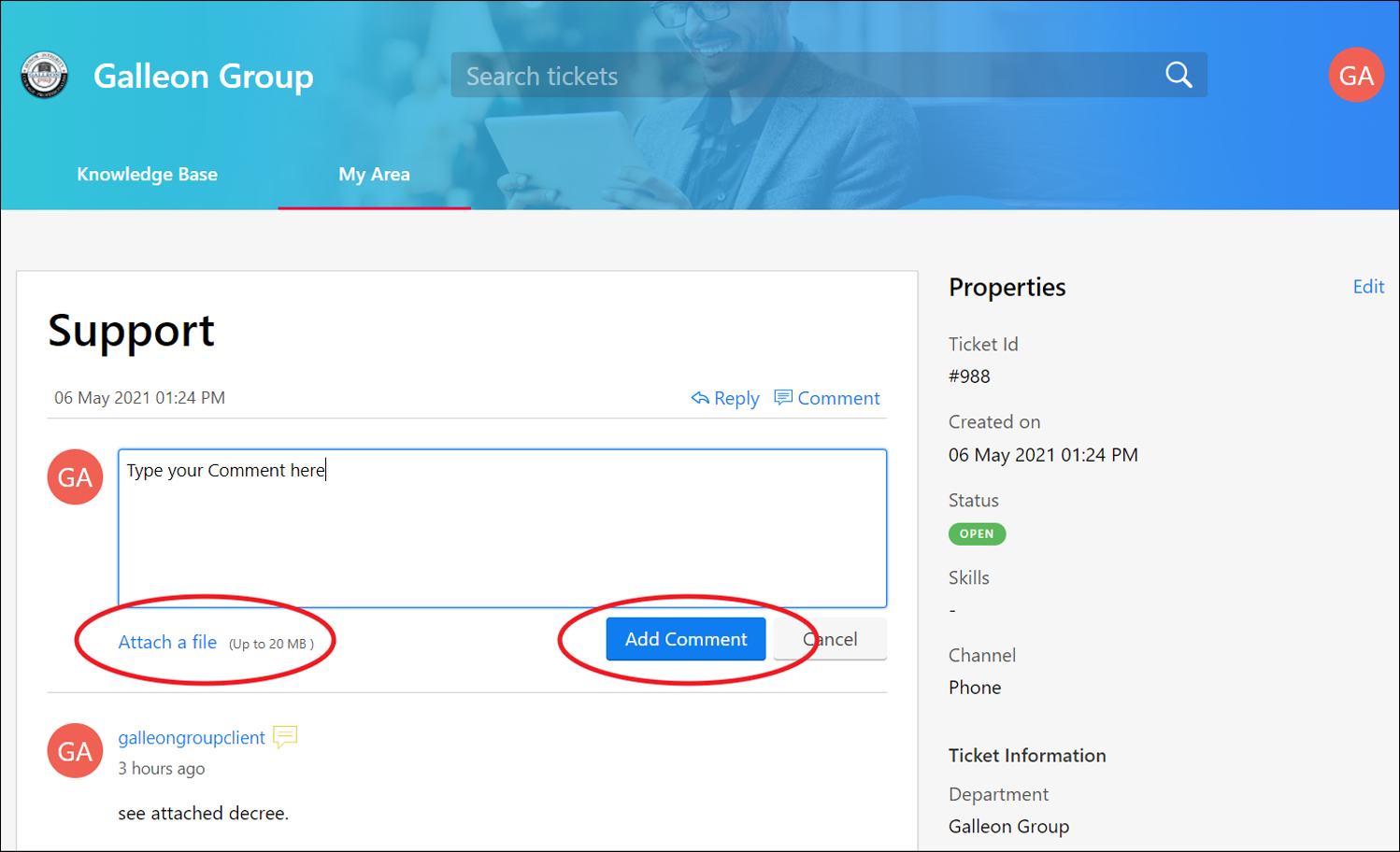 The status of your case consists of comments posted by the Help-Desk. You may Post a Reply or add a Comment to the ticket. Requested documents can be uploaded through the attachment feature.